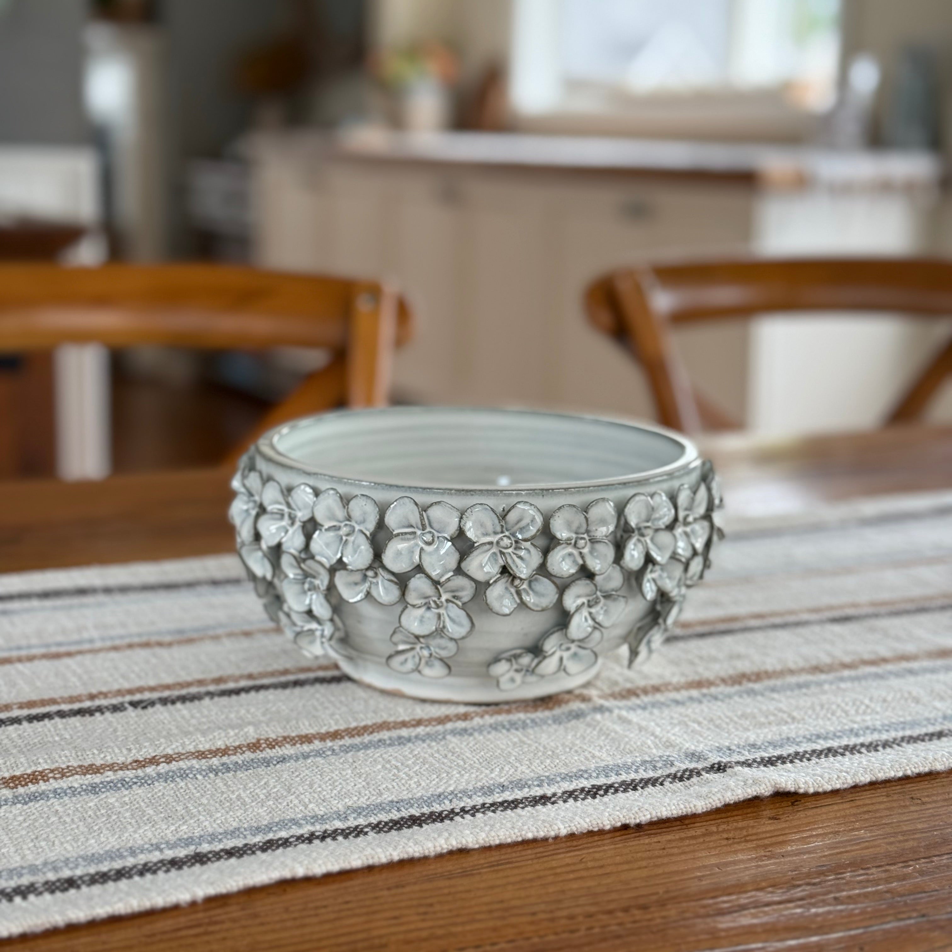 Add a touch of handcrafted charm to your home with this beautifully embossed ceramic bowl, featuring delicate floral details. Perfect for serving snacks, holding small essentials, or simply as a decorative piece, it adds a charming rustic or coastal vibe to kitchens, coffee tables, or shelves. Crafted from high-quality ceramic, this piece measures approximately 1 inch high, 5 inches wide, and 2.5 inches deep — a versatile addition for farmhouse, coastal, or cottage-inspired decor.